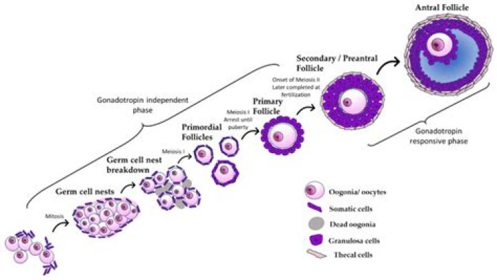 Oogenesis starts in the foetus at around 7 weeks' gestation, when primordial germ cells colonize the newly formed ovary. They are now referred to as oogonia. Oogonia undergo mitosis or rapid proliferation (multiplication).