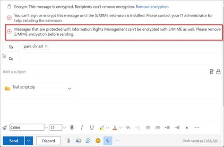 This occurs if the sending mail server did not use TLS encryption when sending the message via SMTP. Firstly, make sure sending over TLS is enabled. ... In the window that appears, click the Outbound tab and make sure Send using TLS if remote server supports it is enabled.