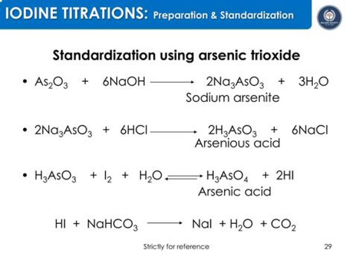 Dissolve the arsenic trioxide in 20 mL of 20% sodium hydroxide solution, add 100 mL of water and 10 mL of dilute sulfuric acid (1:1), and stir. Transfer the potassium dichromate to the solution, using water to loosen any crystals adhering to the beaker.