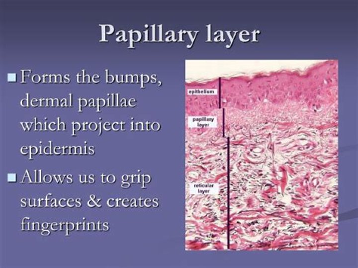 It is characterized by dermal papillae, little bumps that protrude up into the bottom of the epidermis. ... These ridges cause ridges in the overlying epidermis, called epidermal ridges. Those ridges and the sweaty marks they leave are what we call fingerprints.