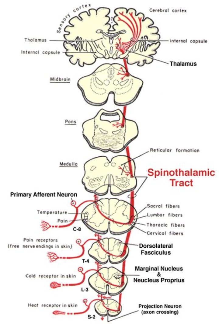 The spinothalamic tract is a collection of neurons that carries information to the brain about pain, temperature, itch, and general or light touch sensations. The pathway starts with sensory neurons that synapse in the dorsal horn of the spinal cord.