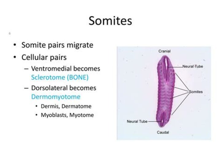 Somites are blocks of mesoderm that are located on either side of the neural tube in the developing vertebrate embryo. ... Somites also determine the migratory paths of neural crest cells and of the axons of spinal nerves.