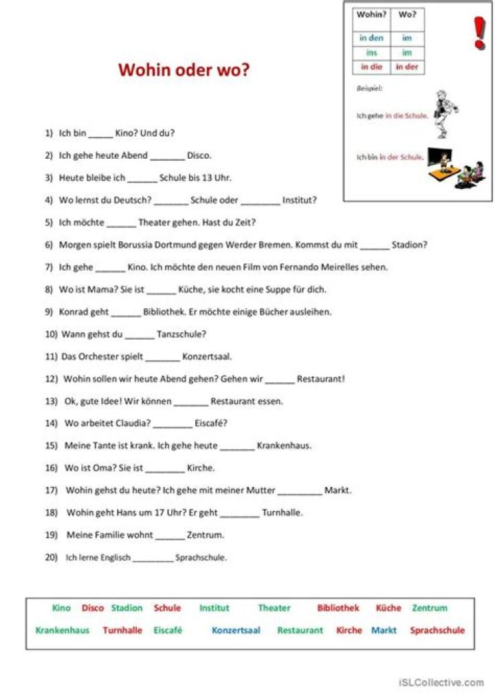 Wohin. German has two question words for asking "where." One is wo? and is used when asking the location of someone or something. The other is wohin? and this is used when asking about motion or direction, as in "where to."What is dative in German?